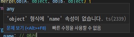 위 코드에서 mergedObj가 name 속성을 가지고 있는 걸 우리는 알고 있음에도 타입스크립트는 이를 잡아내지 못하고 에러가 나옵니다.
